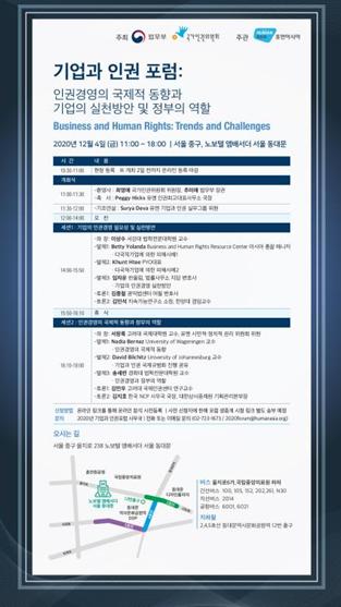 네덜란드 바헤닝언 대학교의 나디아 베르나즈 교수(Nadia Bernaz)는 기업책임법에 관한 유럽 국가들의 사례를 소개하였으며, 남아프리카공화국 요하네스버그 대학교의 데이비드 빌쉿츠 교수(David Bilchitz)는 기업과 인권 국제규범화에 관한 논의를 공유하였다. 송세련 교수(경희대학교 법학전문대학원)는 인권경영의 국제적 동향과 정부의 역할에 대해 토론하였다.