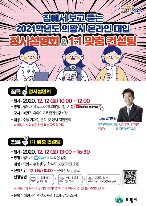 의왕시는 오는 12일 오전 10시에 집에서 보고 듣는 ‘2021학년도 온라인 대입 정시설명회 및 1:1 맞춤컨설팅’을 개최한다고 4일 밝혔다.