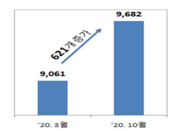 서울특별시는 올해 10월, 서울벤처기업 수가 코로나19의 영향을 본격적으로 받기 시작한 3월 대비 621개 늘어난 9,682개사로 전국에서 최대 증가치를 기록했으며, 증가폭 또한 6.9%로 전국 평균(4.4%)를 상회했다고 밝혔다.
