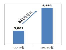 코로나19 발생기간(3~10월) 중에도 지속적으로 증가한 것으로, 이는 창업활성화를 위한 서울시 차원의 다양한 지원 정책이 효과를 내고 있다고 분석된다.
