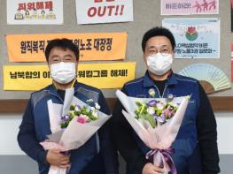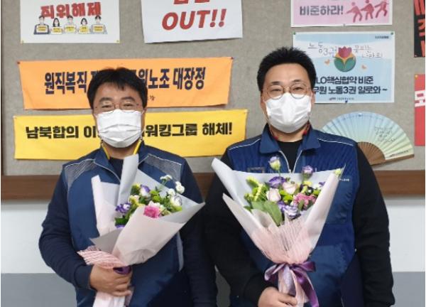 지난 12월 3일 조합 선거관리위원회(위원장 송화영) 주관으로 치러진 제10기 지부장 및 사무국장 선거에서 전체 조합원 445명 중 투표율 86%, 득표율 96%의 지지를 얻어 지부장에는 김동석(44), 사무국장에는 장원우(41)가 당선됐다.