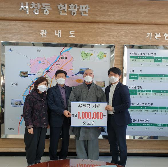 오도암은 서창동행정복지센터가 개소한 이후 2007년부터 해마다 후원금이나 후원물품을 기탁하고 있으며 수년째 이웃사랑을 몸소 실천하고 있다.
