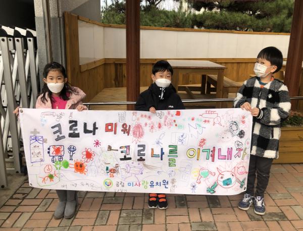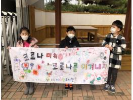 이번 캠페인을 마무리하며 유아들은 코로나를 이겨내고자 하는 마음을 담아 직접 만든 피켓과 현수막을 들고 나와 구호를 외쳤으며 유치원 내에서뿐만 아니라 가정과 지역사회와 함께 할 수 있도록 유치원 담장에 전시하였다.