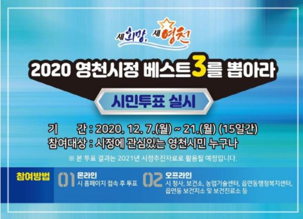 『2020 영천시정 베스트 3』는 집계 후 결과를 12월 말 홈페이지 등을 통해 공개할 예정이다.