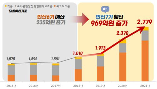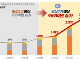 이는 올해 2,370억원보다 409억원(17.2%) 증액된 규모로 민선7기 출범 전인 2018년 대비 969억원(53.5%) 증가한 규모이며, 민선6기 4년간 증가한 235억원(14.9%) 보다 월등히 높은 수준이다.