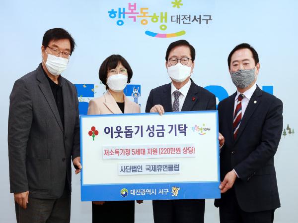 대전 서구는 지난 4일 청사 갑천누리실에서 (사)국제휴먼클럽(총재 백은기)로부터 220만 원 상당의 사랑 나눔 성금 및 후원 물품을 기탁받았다.