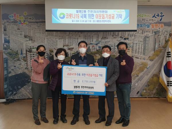 대전 서구 월평2동 주민자치위원회(위원장 김만구)는 지난 24일 해단식을 자체적으로 갖고 그동안 모은 기금 270만 원 상당을 저소득 세대를 돕기 위한 성금으로 기탁했다고 6일 밝혔다.