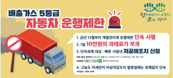계절관리제가 운영되는 기간에는 주말과 공휴일을 제외한 평일 오전 6시부터 오후 9시까지 배출가스 5등급 경유차량의 운행을 제한한다. 1일 첫 단속에서 33대가 적발되었고, 2일 단속에서 49대가 적발되어 해당 차주에게 단속 문자를 발송했다.