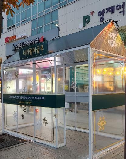 또한, 구는 찬바람을 막아주던 버스정류소 온기텐트 ‘서리풀 이글루’도 개방형으로 업그레이드했다. 자연환기가 가능하도록 조치하고 내부에 대기형 항균 가림막을 설치했다. 밀폐 공간에 대한 불안감을 해소하기 위해 자연환기가 가능하도록 출입문 2면을 개방하고 내부에 항균 가림막을 설치해 버스를 기다리는 사람과 자연스럽게 거리두기를 할 수 있도록 했다. 기존의 폐쇄형 서리풀 이글루는 올 겨울에는 사용하지 않는다.