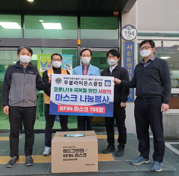 국제라이온스협회 355-D(울산·양산)지구 우불라이온스클럽은 지난 4일 코로나19극복을 위한 사랑의 마스크 나눔행사의 일환으로 ‘마스크 700매’를 양산시 서창동에 기탁했다.