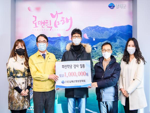 화전학당 강사 일동과 화전학당 수학강사 주승훈 씨가 4일 ㈔남해군향토장학회(이사장 장충남)에 각각 100만 원의 장학금을 기탁했다.