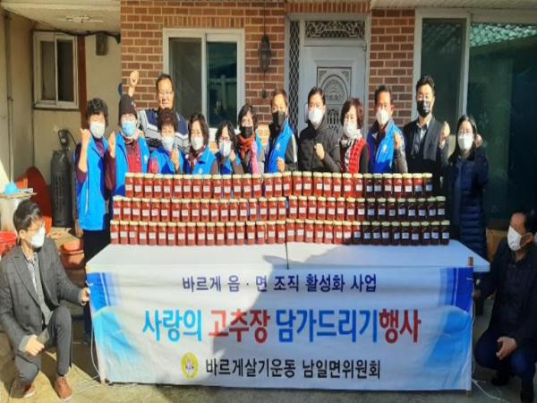 바르게살기위원회 금산군협의회 남일면위원회(위원장 양봉규)는 지난 4일 회원 10여명과 함께 지역 내 어려운 이웃들을 위한 ‘사랑의 고추장 담가드리기’ 봉사를 실시했다.