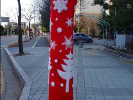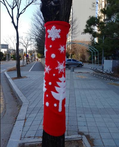 이날 총23개 나무에 매화나무, 눈 내리는 날, 오산의 상징 까산이 등 나무마다 디자인을 다르게 표현한 뜨개옷을 1.5m이상의 길이로 따뜻하게 나무를 덮었다.