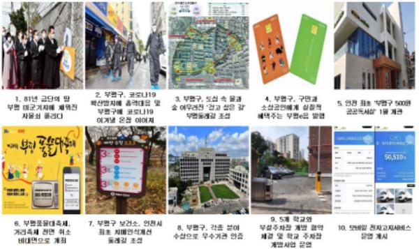 이어 ▲6위 부평풍물대축제, 거리축제 전면 취소 및 비대면 개최 ▲7위 부평구 보건소, 인천시 최초 치매인식개선 둘레길 조성 ▲8위 부평구 각종 분야 수상으로 우수기관 인증(성별영향평가 최우수기관, 매니페스토 우수사례 경진대회 우수상 등) ▲9위 5개 학교와 부설주차장 개방협약 체결 및 학교 주차장 개방사업 운영 ▲10위 모바일 전자고지서비스 운영 개시 등이 부평의 10대 뉴스로 선정됐다.