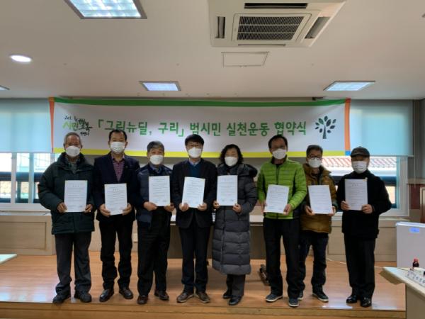 이번 협약은 동과 기간단체가 공동으로 지구위기에 대응하기 위하여 지역에서부터 시작하는 그린뉴딜 범시민 실천운동에 적극적으로 참여하고, 그린뉴딜 분위기를 확산시켜 시민과 함께하는 「그린뉴딜, 구리」을 추진하기 위함이다.