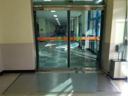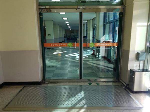 미세먼지 흡입매트는 센서를 통해 사람이 흡입매트 위를 걸으면 흙이나 미세먼지 및 주변 공기를 흡입하여 정화하는 공기정화 기능을 갖고 있어 오염물질이 실내로 유입되는 것을 차단하는 시설이다.