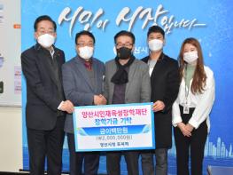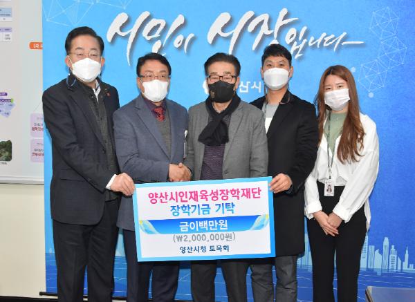 양산시 토목회(회장 이강명)는 연말을 맞아 인재육성을 위해 써달라며 장학금 200만원을 양산시인재육성장학재단(이사장 임재춘)에 기탁했다.