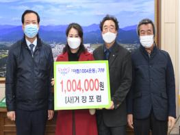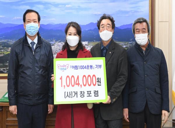 7일 (사)거창포럼(대표 김칠성)에서 아림1004 후원금 1,004천원을 기탁했다. 거창포럼은 거창발전을 위해 결성된 사단법인으로 그동안 토론회 개최, 봉사활동, 소외계층 돕기 등의 사업을 통해 거창군민의 복지향상 증진을 위해 노력해왔다.