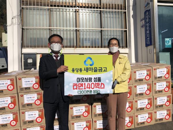 부산 남구 용당동새마을금고는 지난 12월 5일 연말연시를 맞이하여 라면 140박스(300만원 상당)를 용당동행정복지센터에 전달했다고 밝혔다.