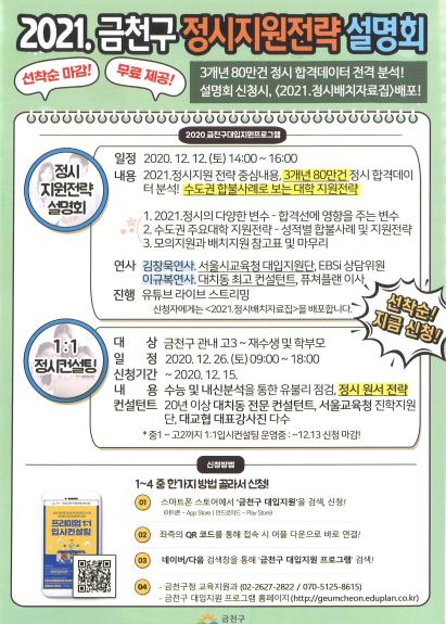 금천구가 오는 12일 오후 2시부터 4시까지 지역 학생과 학부모를 대상으로 ‘2021 금천구 정시지원전략 온라인 설명회’를 개최한다.