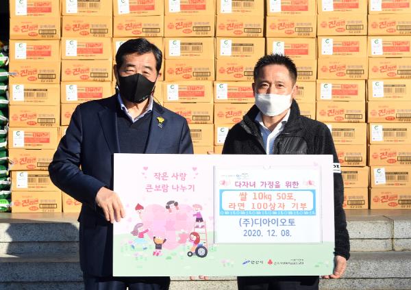 안산시는 8일 ㈜디아이오토(대표 류광열)에서 다자녀 가정을 위해 써달라며 사랑의 쌀 10㎏ 50포와 라면 100박스를 기탁했다고 밝혔다.