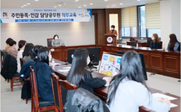 거리두기, 마스크 착용 등 철저한 방역수칙을 준수하며 진행된 이번 직무교육은 각 읍·면·동 주민등록 및 인감 담당자를 대상으로 주민등록증 부정발급 등 각종 민원업무 관련 사고를 예방하고, 정확하고 신속한 행정서비스를 실현하기 위해 실시한 민원담당자 역량강화 교육이다.