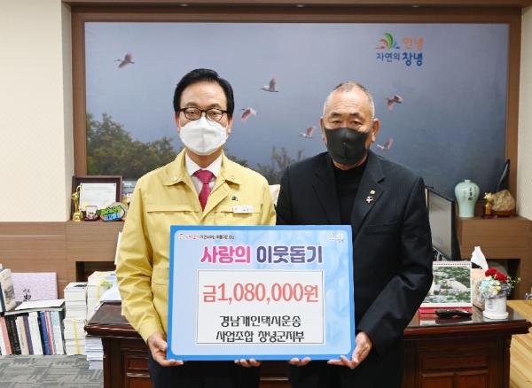 개인택시조합 창녕군지부(지부장 채용해)는 지난 7일 연말을 앞두고 지역 내 어려운 이웃에게 전달해 달라며 성금 108만 원을 창녕군(군수 한정우)에 기탁했다.