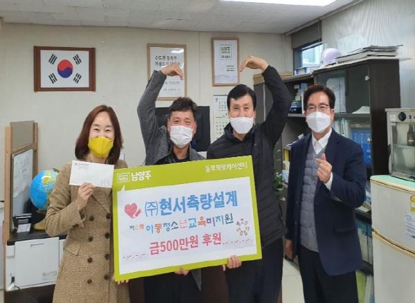 남양주시 화도읍 소재 현서측량설계사무소(대표 맹규영)에서는 지난 7일 화도수동행정복지센터(센터장 박부영)를 방문하여 저소득아동을 위한 후원금 500만원을 전달했다.