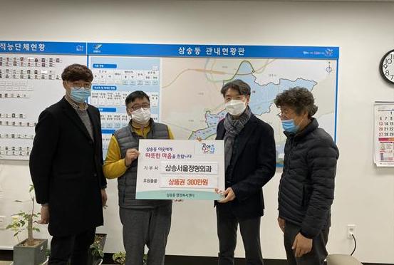 고양시 덕양구 삼송동행정복지센터(동장 이재천)는 지난 4일 관내 위치한 삼송서울정형외과 의원(원장 김정재)에서 연말연시 어려운 주민들을 위해 써달라며 상품권 3백만 원을 기탁했다고 밝혔다.