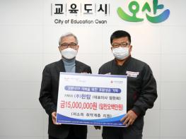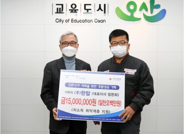 오산시는 8일 ㈜한탑(대표이사 엄한희)에서 시청을 찾아 관내 저소득층을 위해 사용해 달라며 성금 1500만원을 기탁했다고 밝혔다.