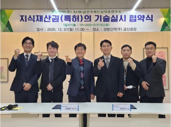 (재)금산국제인삼약초연구소는 7일, 연구소가 보유 중인 팽화흑삼 및 이의 제조방법과 관련된 지식재산권(실시기술:10-2020-0151522호)을 경방신약(주)에 기술이전하고 사업화를 위한 전수 및 기술협력을 약속하는 협약을 체결했다.