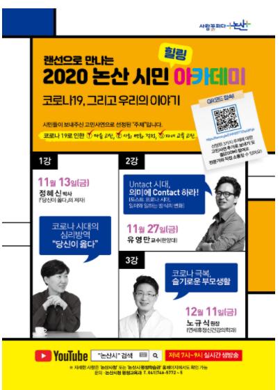 한편, ‘2020 논산시민아카데미’는 지난 11월 13일 ‘코로나 시대의 심리방역’을 주제로 한 정혜신 박사와의 대화로 문을 열어, 11월 27일 ‘Untact 시대, 의미에 Contact하라!’를 주제로 한 유영만 교수에 이어, 이번 강좌를 끝으로 마무리 된다.