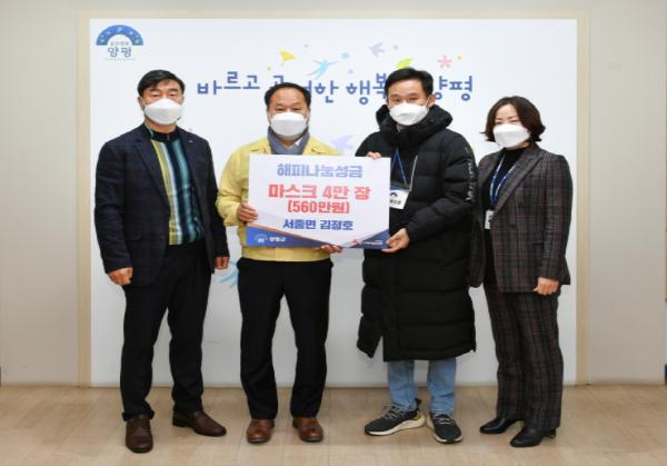 양평군 서종면 김정호 씨가 마스크 4만장, 새마을회·환경미화원에서 성금 5백만원을 기탁하며 코로나19 극복을 위해 마음을 모았다.