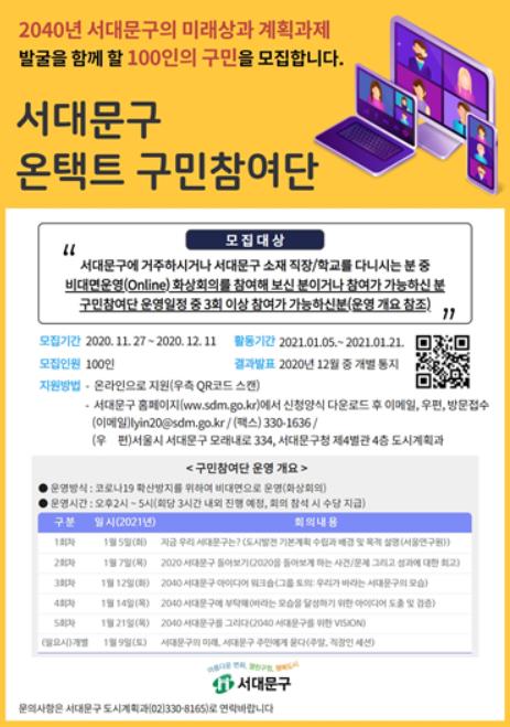 ‘서대문구 온택트 구민참여단’은 화상회의에 3회 이상 참여 가능한 성인 100명으로 구성되며 신청자가 많을 경우 별도의 선정 절차가 진행된다.