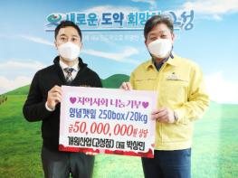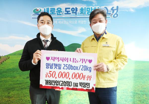 고성군 개원산업 고성점(대표 박상민)은 12월 7일 고성군청을 방문하여 어려운 이웃을 위해 양념깻잎 250박스(5,000만 원 상당)를 기탁했다.