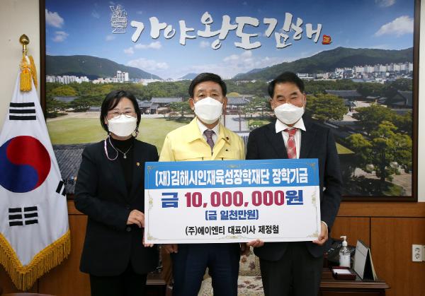 김해시인재육성장학재단은 8일 ㈜에이엔티(대표이사 제정철)에서 장학기금 1000만원을 기탁했다고 밝혔다.