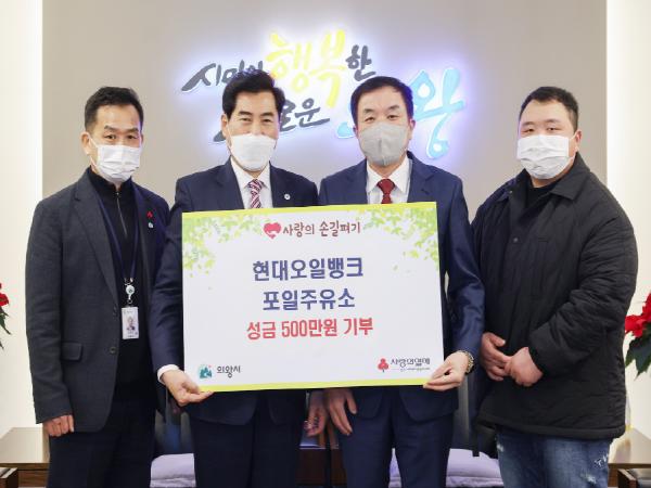 의왕시 청계동에 소재한 현대오일뱅크 포일주유소(대표 박진태)에서 8일 저소득층을 지원해달라며 성금 500만원을 의왕시에 기부했다.