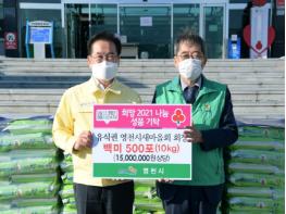 영천시(시장 최기문)는 지난 3일 새마을회(회장 유석권)로부터 희망 나눔 성금으로 쌀 500포(10kg) 및 장학금 500만원을 기탁 받았다.