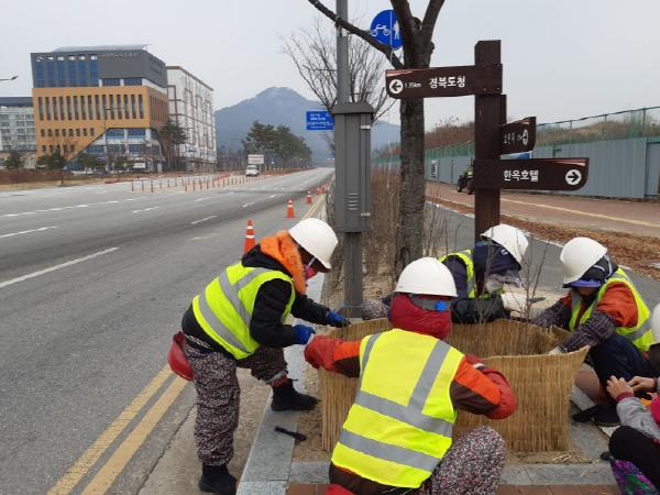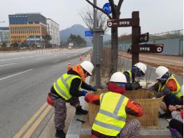 시는 지난 4일부터 도로변 가로화단 수목의 동절기 염화칼슘 피해방지 및 한파로부터 생육을 도모하기 위해 방풍벽 설치공사를 추진하고 있다.