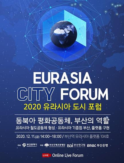 부산시는 부산국제교류재단, 부산연구원, 부산은행과 함께 12월 11일 오후 2시부터 「2020 유라시아 도시포럼」을 온라인 비대면으로 개최한다고 밝혔다.