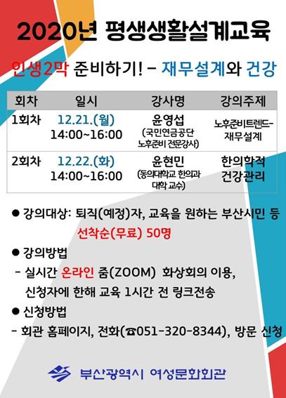 부산시 여성문화회관은 생애 설계 및 재취업, 노후설계 기회를 제공하기 위한 「2020년 평생생활설계교육」을 실시간 온라인으로 개최한다고 밝혔다.