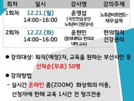 이번 특강은 ‘인생 2막 준비하기!-재무설계와 건강’을 주제로 12월 21일, 22일 양일간 오후 2시부터 4시까지 2시간 동안 진행되며, ▲(12월 21일) 국민연금공단 노후준비 전문가 윤영섭 강사의 ‘노후준비 트렌드-재무설계’와 ▲(12월 22일) 동의대학교 한의과대학 윤현민 교수의 ‘한의학적 건강관리’의 2개 강의로 구성된다.