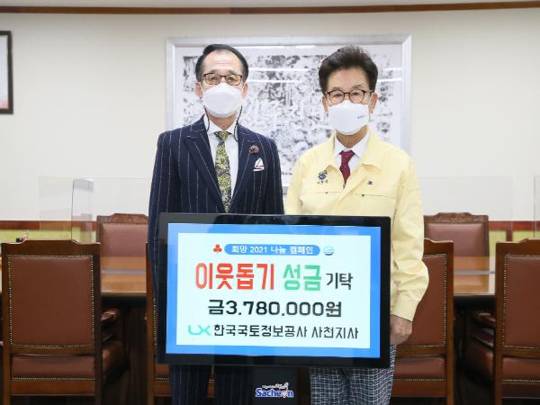 한국국토정보공사 사천지사는 매년 연말연시 어려운 이웃을 위한 성금을 기탁하고 있으며, 이번 기탁은 동절기 및 코로나 확산으로 어려움을 겪고 있는 저소득층을 위해 임직원들의 자발적인 모금으로 이루어져 더욱 뜻깊다.