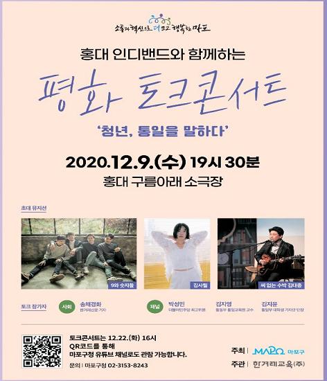 마포구가 9일 홍대 인근 구름아래소극장에서 ‘청년, 통일을 말하다’라는 주제로 평화 토크콘서트를 개최한다고 밝혔다.