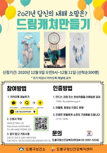 참여방법은 카카오톡에서 도봉구정신건강복지센터 채널을 추가 후 집콕 키트를 신청하면 된다. 신청시 카카오톡 채널에 게시된 네이버 링크에 접속해 신청서 및 새해 소망을 작성하면 된다.