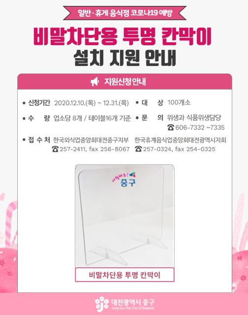 대전 중구는 코로나19 확산 방지를 위해 일반?휴게음식점에 비말차단용 투명칸막이를 지원한다.
