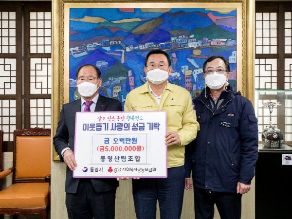 통영산림조합(조합장 허일용)은 12월 8일 통영시를 방문해 연말 이웃돕기 사랑의 성금 500만원을 ‘살고싶은 통영 행복펀드’에 기탁했다.