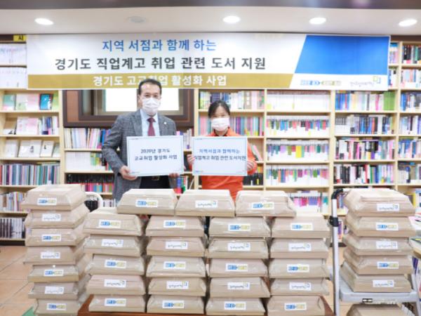 경기도일자리재단이 8일 ‘지역서점 상생 도서지원 캠페인’을 열고 재단 ‘고교취업 활성화 사업’ 참여 학교 42곳에 직무교육·취업 관련 도서 210권을 전달했다.