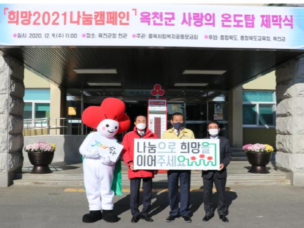 군은 9일을 ‘옥천군 나눔 참여의 날’로 지정하고, 군청 중앙 현관에서 최소 인원만 참석한 가운데 ‘사랑의 온도탑 제막식’을 가졌다.