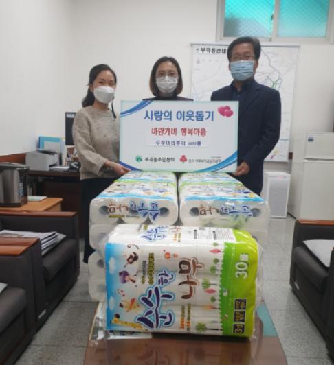 의왕시 부곡동 마을공동체‘바람개비 행복마을’에서 지난 8일 부곡동 지역의 어려운 이웃을 위해 사용해 달라며 두루마리 휴지 800롤을 부곡동주민센터 찾아가는 보건복지팀에 전달했다.